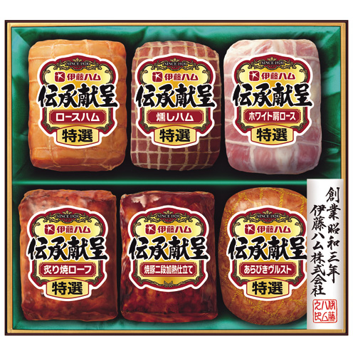 特選ロースハム320g・特選燻しハム180g・特選ホワイト肩ロース180g・特選炙り焼ローフ160g・焼豚二段加熱仕立て160g・特選あらびきヴルスト160g