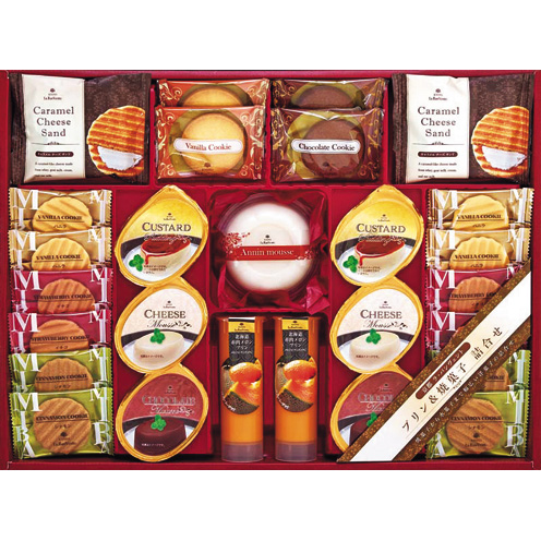 キャラメルチーズサンド×2、クッキー(バニラ・チョコ)×各2、ミニョンバーグクッキー(バニラ・イチゴ・シナモン)×各4、アンニンムース110g、赤肉メロンプリン95g×2、カスタードプリン65g×2、ムース(チョコ・チーズ)65g×各2