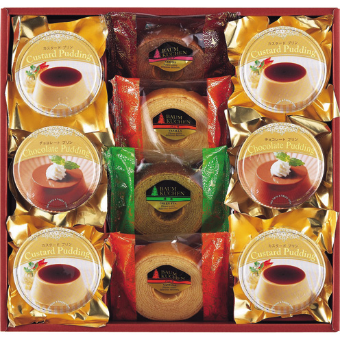 2割引ギフトしっとり焼き上げたバームクーヘンとまろやかな甘さのプリンの詰合せです。