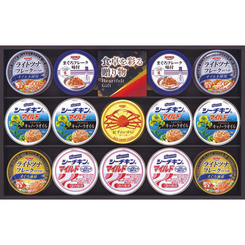 はごろもシーチキン(マイルド×3・マイルドキャノーラ×4)各70g、宝幸(紅ずわいがにほぐし身55g・まぐろフレーク味付70g×2・ライトツナフレークまぐろ油漬70g×2・ライトツナフレークオイル不使用70g×2)