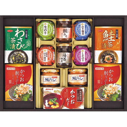 磯じまん(鯛みそ100g・海苔佃煮90g)、小豆島産佃煮(のり・しそのり・紀州梅のり・生のり)各80g、マルトモ(かつお削りぶし1.5g×4袋×2・かつおだし8g×5P)、鮭ほぐし40g×2、白子のり(鮭茶漬3.8g・わさび茶漬3.3g)×各3