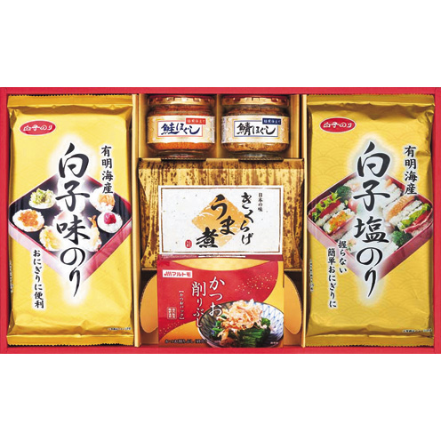 白子のり(味のり・塩のり)各2切5枚×各2、きくらげうま煮80g、マルトモかつお削りぶし1.5g×4袋、鮭ほぐし40g、鯖ほぐし40g