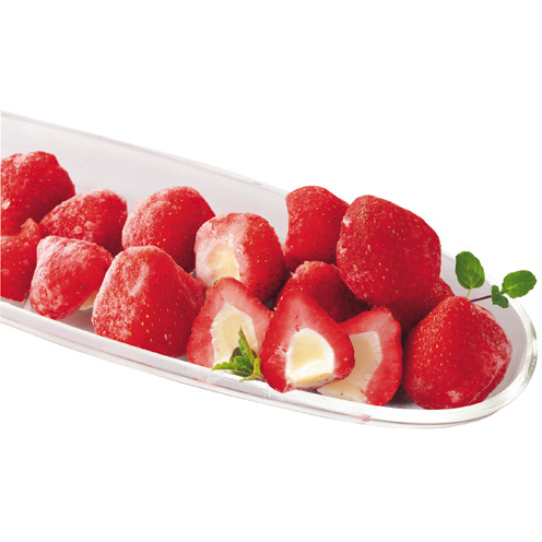 送料無料 冷凍苺の中心を丁寧にくり抜いて、練乳味のアイスを絞り込みました。