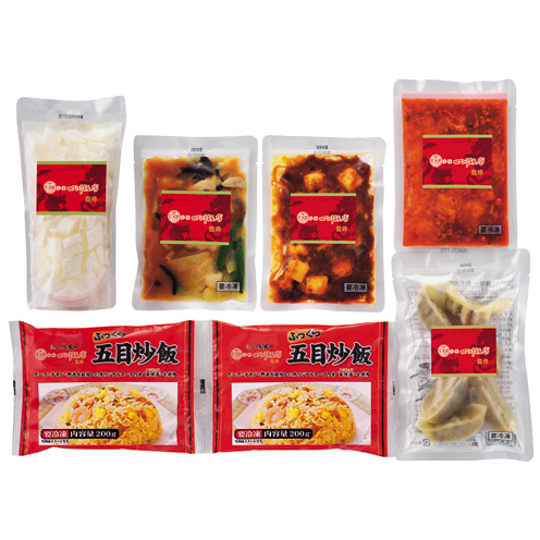 餃子120g(6個入)、本格四川麻婆豆腐150g、乾焼蝦仁(エビチリソース)150g、本格八宝菜150g、ふっくら五目炒飯200g×2、杏仁豆腐500g
