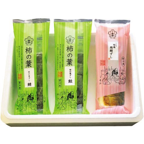 柿の葉ずし鯖5個入(195g)、柿の葉ずし鮭5個入(195g)、柚庵焼鯖ずし(7切)(300g)