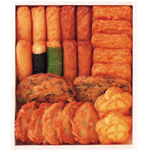 特揚げ棒天4本、いわし棒天4本、のり巻棒天1本、しそ巻棒天1本、にんじん天5枚、ごぼう天5枚、五目揚げ2枚、梅おはら揚げ(黄)2個