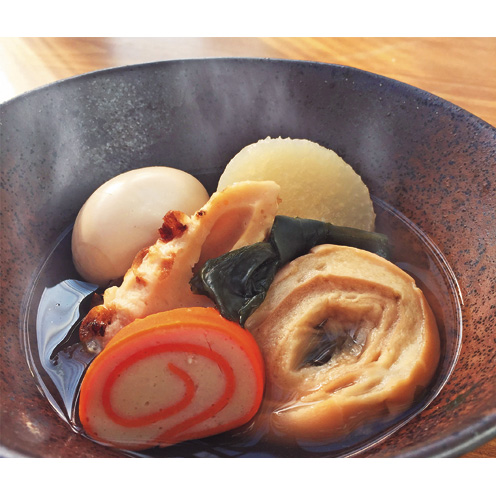 送料無料上品な昆布とかつおのあわせ出汁に、大根、車麩、赤巻かまぼこ等六種の具材が入ったユニークなおでん。