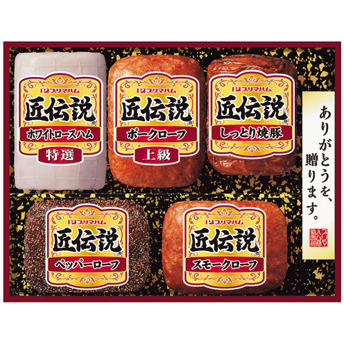特選ホワイトロースハム180g、上級ポークローフ140g、しっとり焼豚160g、ペッパーローフ140g、スモークローフ140g
