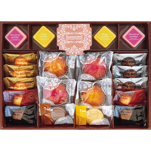 プリン(ストロベリー・マンゴー)各57g×各2、マドレーヌ(レモンチーズ・ストロベリー)×各2、タルト(プレーン・ショコラ)、クッキー(ココア×3・バニラ×3・ココナッツ×2・アーモンドショコラ×2)