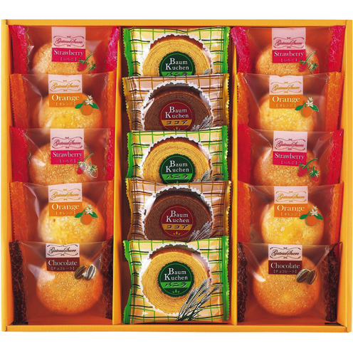バームクーヘン(バニラ?3個、ココア×2個)、ブッセ(イチゴ・オレンジ×各4個、チョコ×2個)