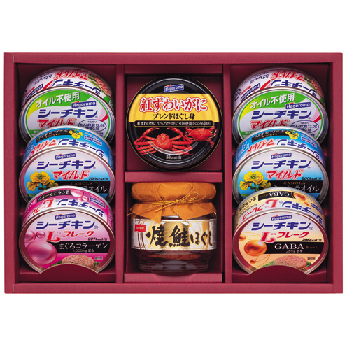 オイル不使用シーチキンマイルド70g×2、シーチキンマイルドキャノーラオイル70g×2、シーチキンLフレークコラーゲン入り70g×1、シーチキンLフレークGABA入り70g×1、紅ずわいがにブレンドほぐし身55g×1、ニッスイ焼鮭ほぐし50g×1