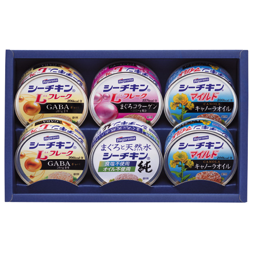 シーチキンLフレーク(GABA入り70g×2、コラーゲン入り70g×1)、まぐろと天然水だけのシーチキン純70g×1、シーチキンマイルドキャノーラオイル70g×2