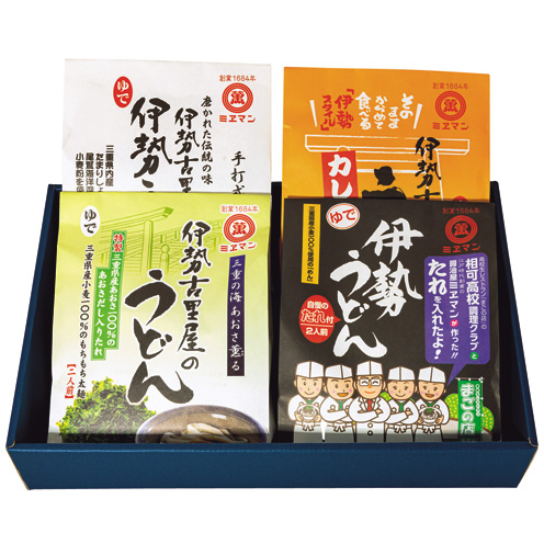 1割引ギフトミヱマン人気の伊勢うどん、カレーうどん、相可高校コラボ伊勢うどんに伊勢古里屋のあおさ薫るうどんが加わった4種類セット。