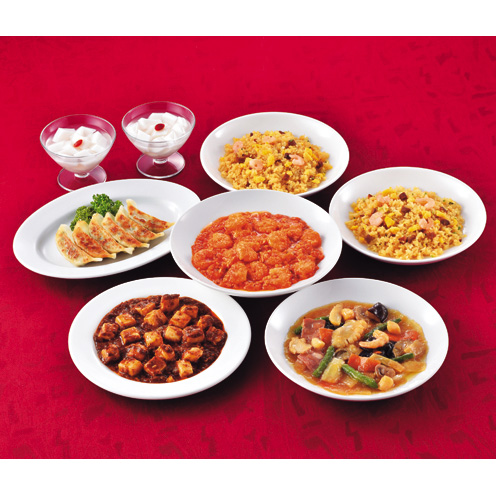 餃子120g(6個入)、本格四川麻婆豆腐150g、乾焼蝦仁(エビチリソース)150g、本格八宝菜150g、ふっくら五目炒飯200g×2、杏仁豆腐500g
